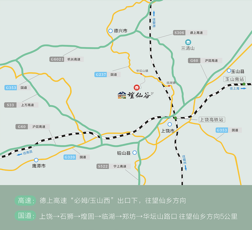 5、南昌至景区:德昌高速→德兴出口下(165公里)→201省道→上饶县望仙乡(30公里)